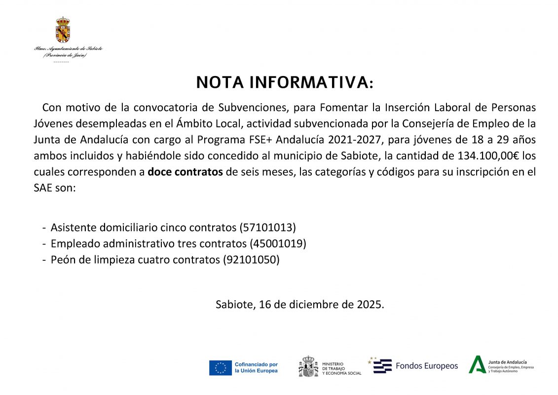 Aquí encontrará las últimas noticias publicadas en la WEB oficial del Ayuntamiento de Sabiote.